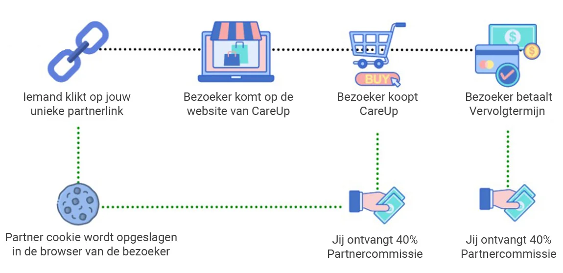 You will receive a personal affiliate link with which you can promote CareUp. When someone clicks on your affiliate link , a cookie is placed on their device that lets our payment system know that this sale was made through you. This sale is then automatically linked to your account.